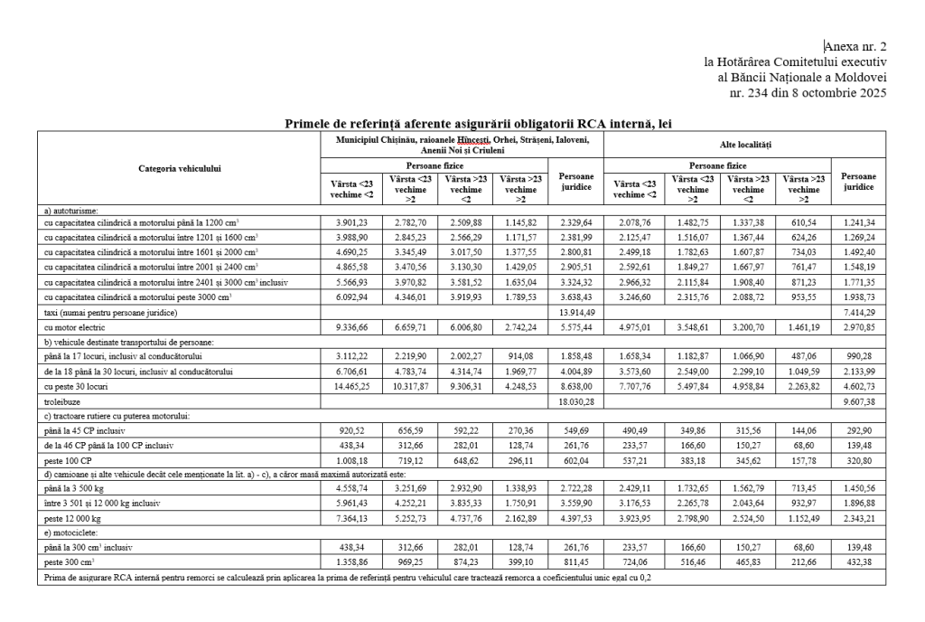 - Hotărârea Nr. 234 din 08-10-2025 cu privire la aprobarea calculului primelor de asigurare de bază coeficienților de rectificare și primelor de referință pentru RCA și Carte Verde.